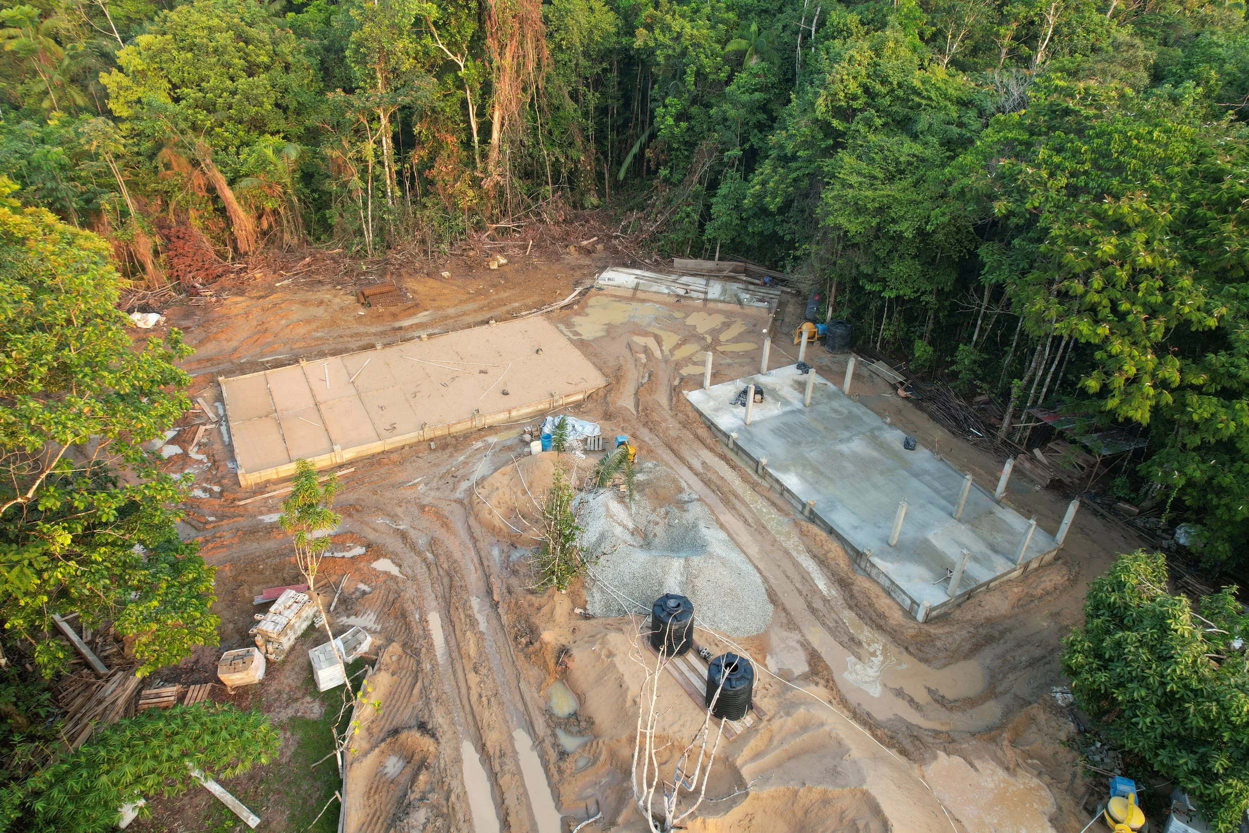 Delivering a building project of this scale in a location accessible only by river, whilst being completely off-grid, was not straightforward. Just starting the project required three 50ft barges loaded with hundreds of tonnes of stone, steel, timber and machinery to land at Sophia Point and offload. Once on site, the team, led by Contractor Indar Rammlall, got to work assembling staff quarters, preparing the ground and marking out the dimensions of the centre.